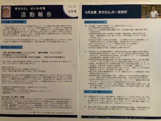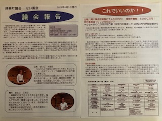 ![]() 青木さとし せいかの風 ![]() せい風会 議会報告 晴天の霹靂(へきれき) このような場合に使う言葉かどうかわかりませんが、いきなりPCR検査を受けることになりました。近くに住んでいる孫がコロナになり、その直前に同じ所に15分以上一緒にいたためです。一昨日、最初に娘婿が熱で会社を早退して来て夕方診療所に行き検査して、陽性ということが昨日わかりました。昨日の夕方娘も熱が出て、陽性でした。孫二人は元気にしていたので娘たちと一緒ではと思い、うちで預かりましたが、夕方に孫が熱を出したので検査をしたら陽性でした。私は娘たちとは普段接することはないのですが、うちのは孫たちを送ったりしていますので、濃厚接触者になるのではと思っていたのですが、私までとは、です。 今のところ、私もうちのも熱は出ていません。二人ともワクチンの接種は終わっているので、今は体の中で戦っているのかも知れません。もしワクチン接種をしていなかったら・・・今のところ陰性だと思っているのですが・・・ 電話がありました 昨日、私の「青木さとし せいかの風」の議会報告を新聞に折り込みました。そしたら今日、議会報告を読んだと電話がありました。菱田の方で、今まで町政にはあまり関心はなかったけど、読んで「あれはいけない(公平にやってくれないと)」とのことでした。少し小さいかも知れませんが、写真で掲載しました。また、別途会派の議会報告も新聞折込いたしましたので、近日中に配布されます。ぜひ、ご一読ください。 |